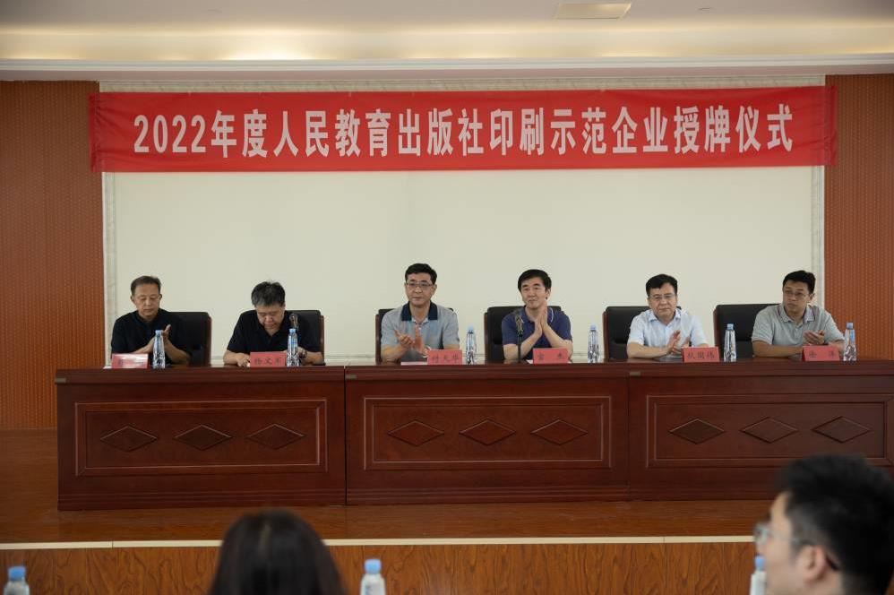 7月28日下午,人教社2022年度印刷示范企業(yè)授牌儀式在新華印務泰安分公司舉行,人7月28日下午,人教社2022年度印刷示范企業(yè)授牌儀式在新華印務泰安分公司舉行,人民教育出版社副社長付天華、出版部主任狄國偉,股份公司常務副總經(jīng)理宮杰、副總經(jīng)理楊文軍、教育產(chǎn)業(yè)部副主任徐洋,新華印務公司董事長肖剛、總經(jīng)理貴雪媛等參加儀式,股份公司副總經(jīng)理楊文軍主持儀式。