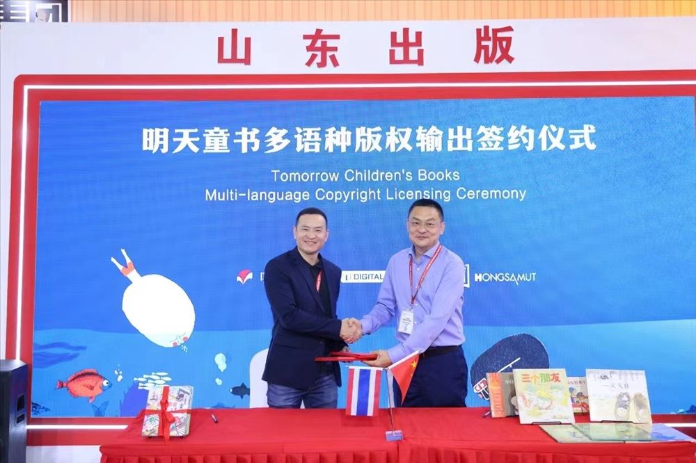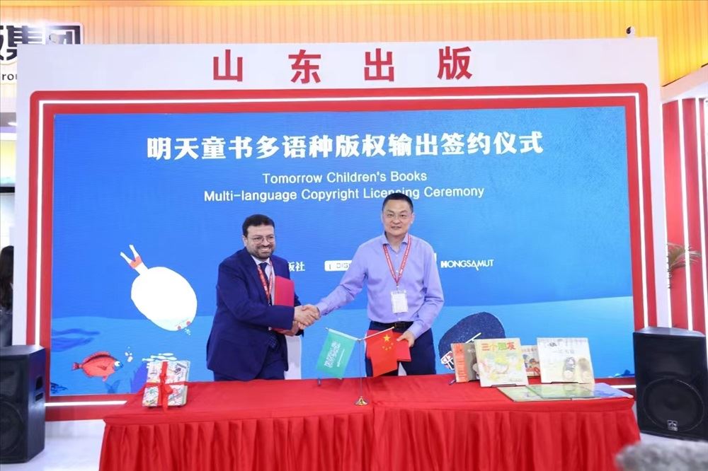 簽約儀式上,明天出版社社長李文波分別與紅山出版有限公司副總編輯俞春華、數字未來公司總裁穆罕默德•哈比卜就“明天原創圖畫書”泰文版、“揭秘翻翻書”阿拉伯文版的輸出簽訂了合同。